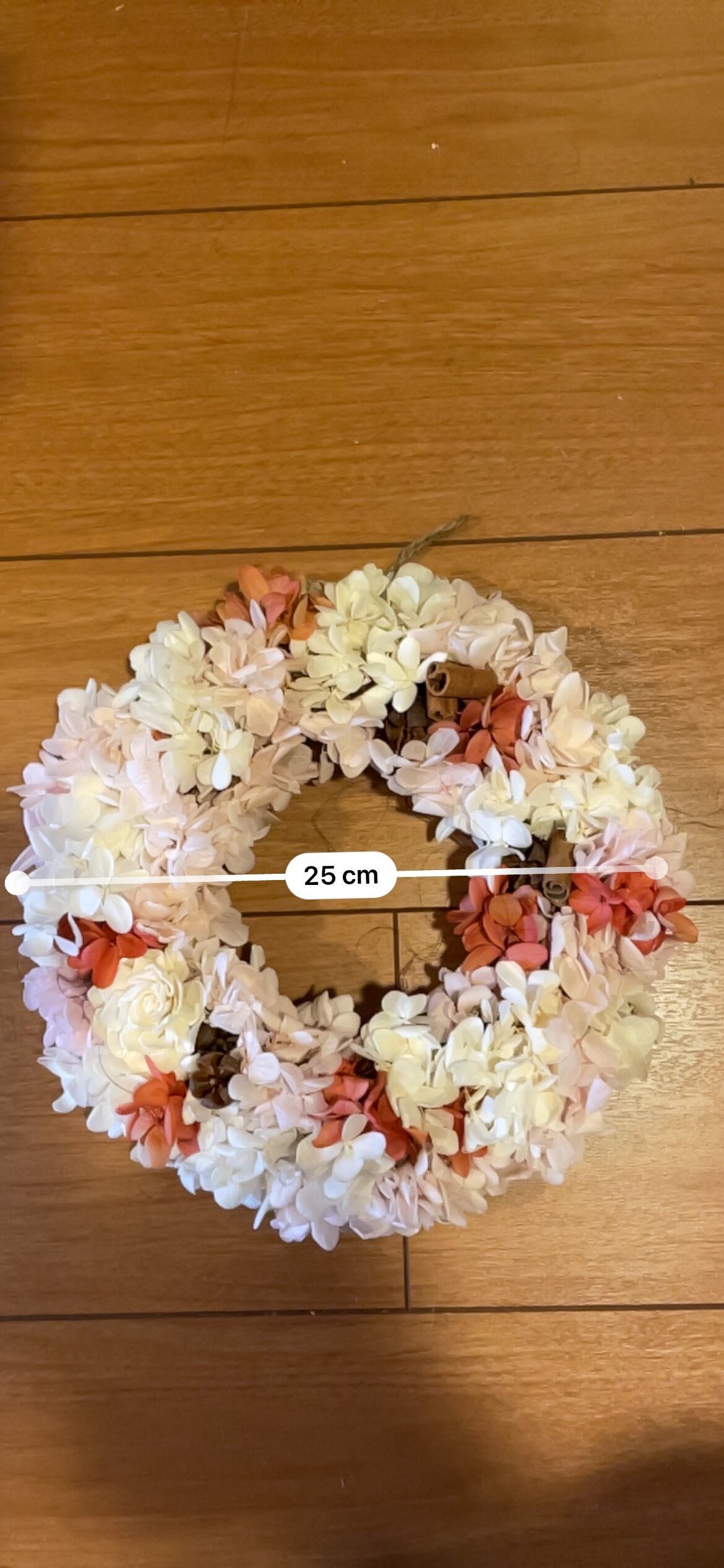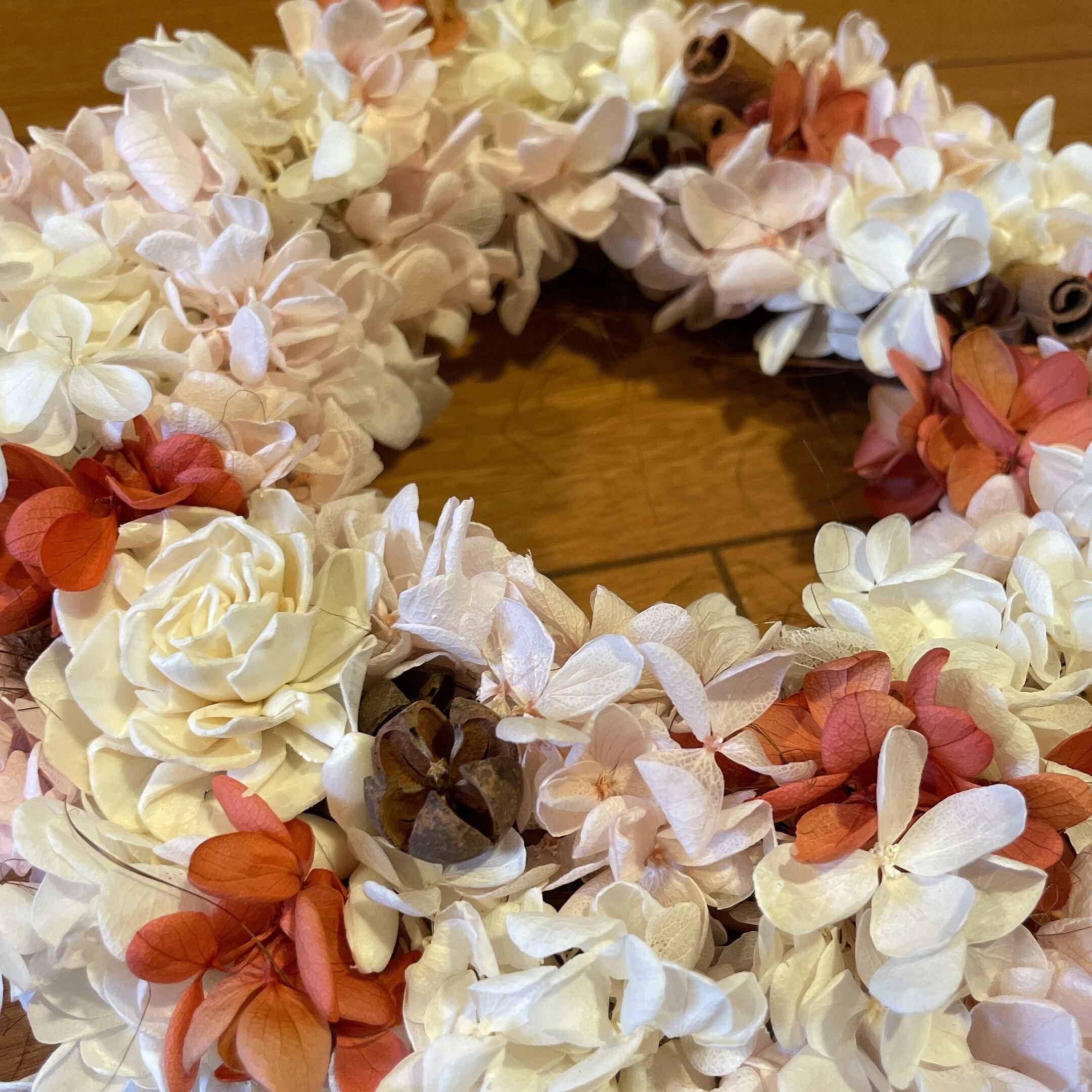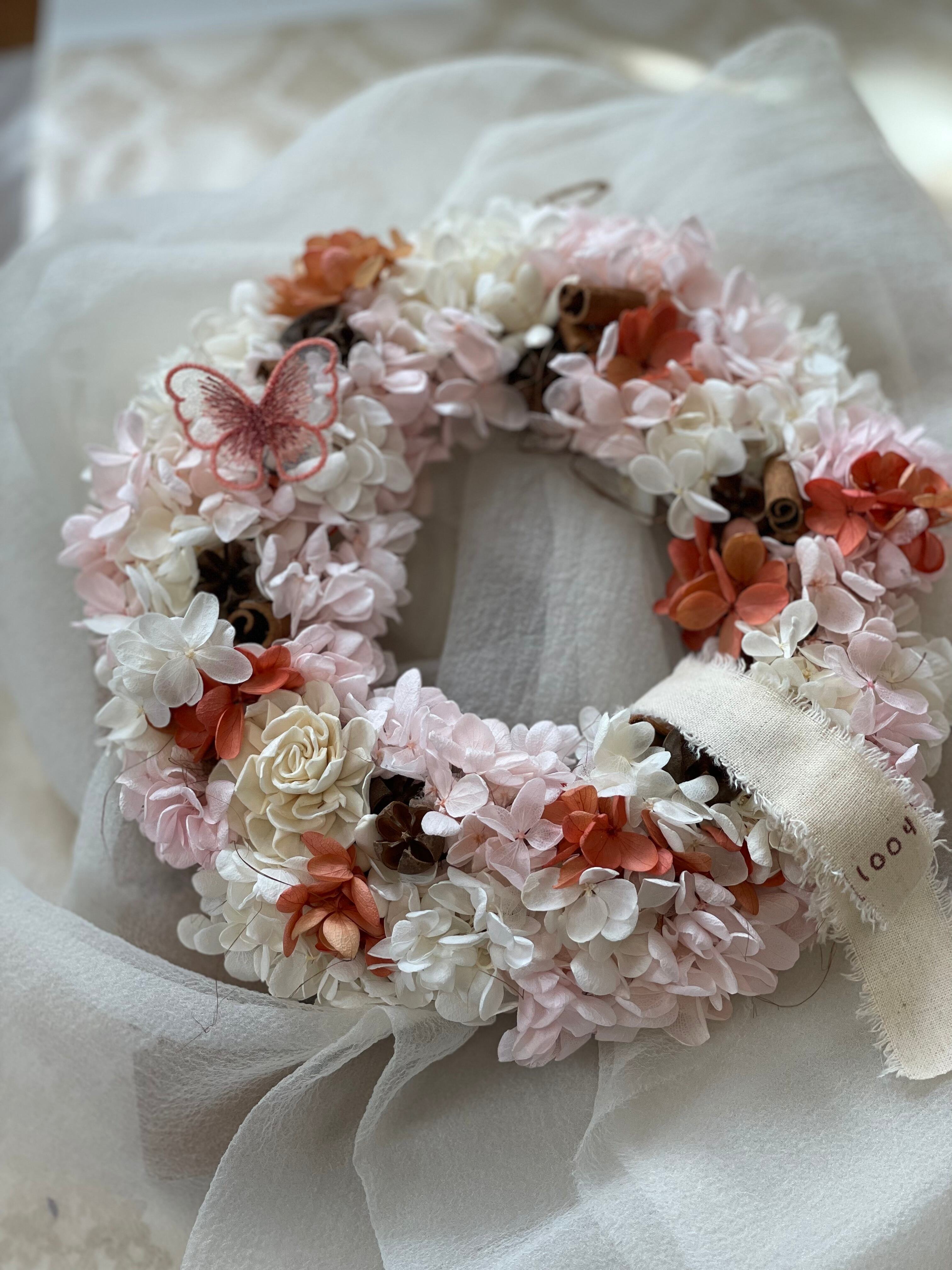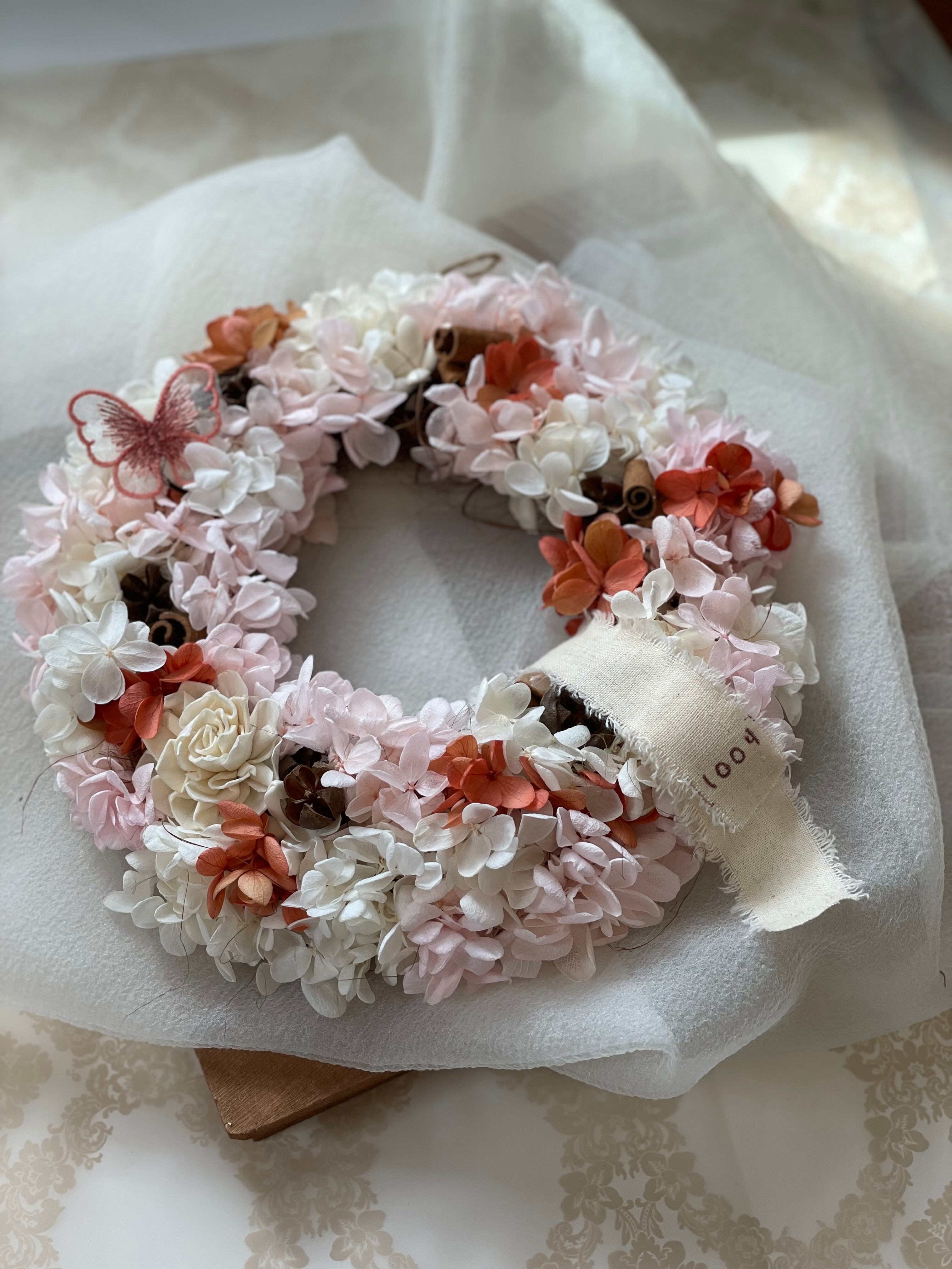 あじさいのプリザーブドプリザーブドを使ったリースです。ホワイトと淡いピンクをベース柔らかい色合いに濃いめの暖色系をアクセントに、一年中季節を選ばず飾って頂けるリースてす。